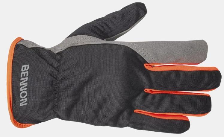 Textilní šitá rukavice vyrobena z polyesteru, dlaň ze syntetické usně, v zápěstí gumka.
